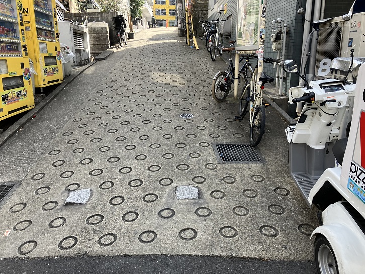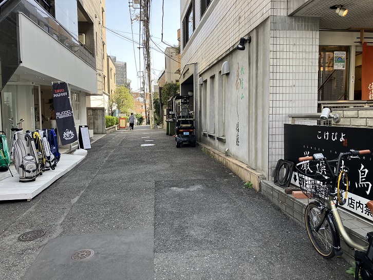 飲食店が入るビルの間を抜けた先から階段が下っています。