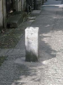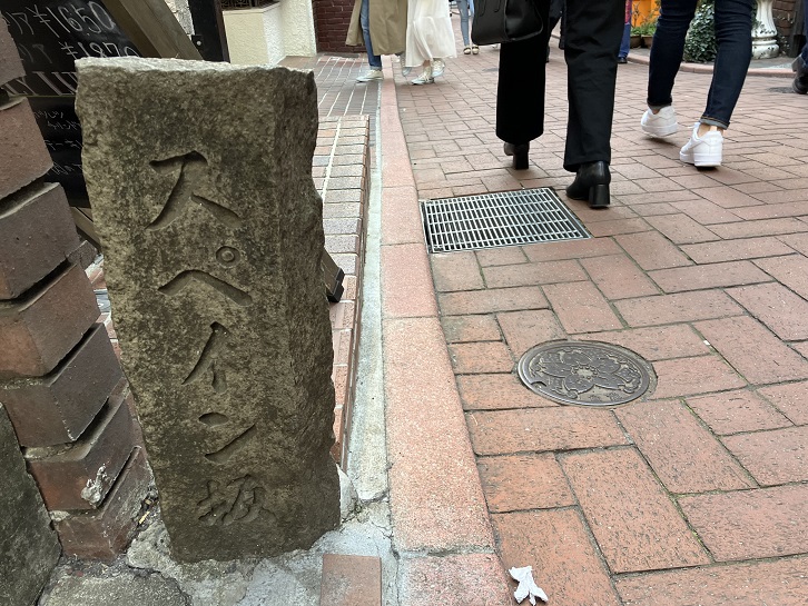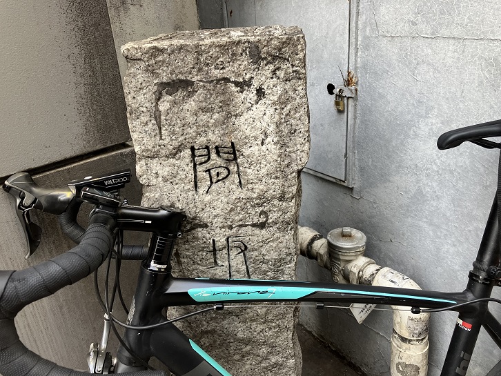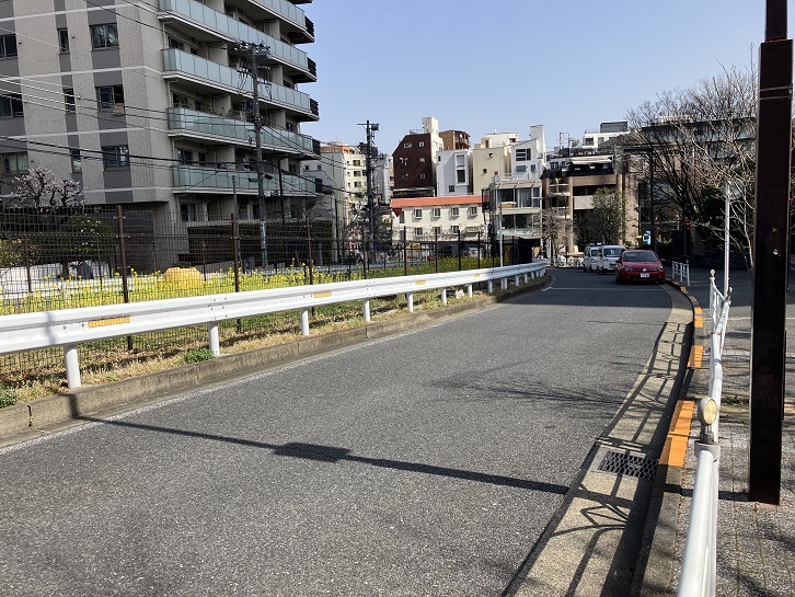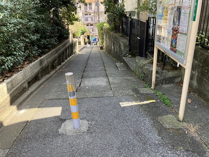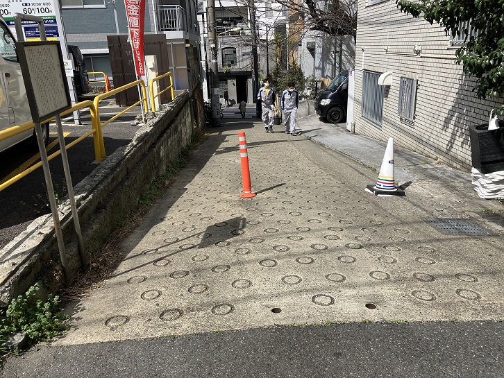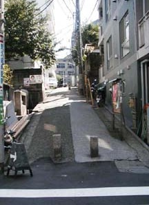 山手線の跨線橋を渡った先で右手の路地に入りますと、少し先から短かい坂が下っています。以前は車の通行が出来ないように坂上と坂下の道路の真ん中に石の杭が立っていて、坂上の石杭には「てんぐ坂」と彫られていたそうです。現在は石の杭は撤去されて根元だけ痕跡を留めています。