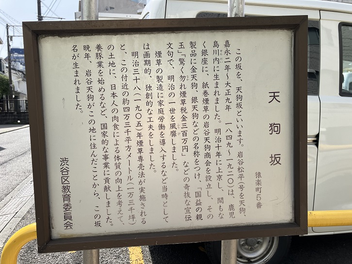 天狗坂は長さが約70mほどのやや急な坂です。坂名は、岩谷天狗商会を興した岩谷松平が晩年この地に住んだことに因んでいます。坂上に案内板が立っています。