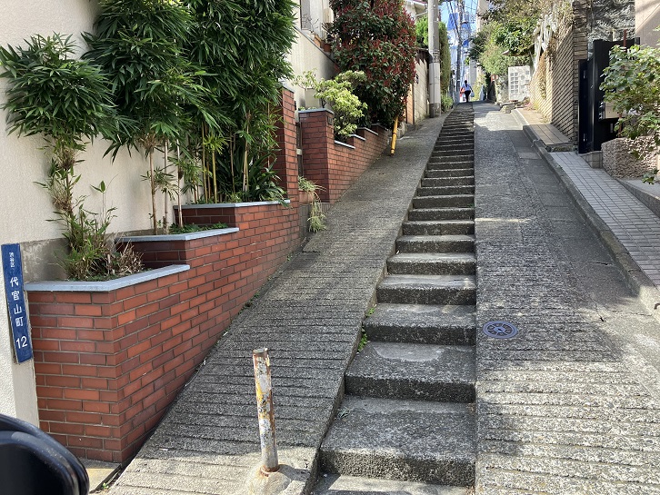 代官坂は長さが約110mほどの狭く緩やかな階段です(階段の両脇はスロープになっています)。「代官山」とは幕府の御林で、その管理は代官がしていました。代官山の坂ということに因んでこの坂名が付けられました。