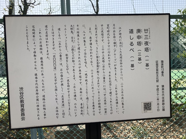 江戸時代に流行した民間信仰のひとつに、ニ十三日の夜に集まって月の出を待つ講中(グループ)がありました。これを廿三夜講といい、室町時代からすでに行われており、それを記念して建てられたものが廿三夜塔です。この廿三夜塔(右から二番目)には、「廿三夜待一結衆」と刻まれており、さらに勢至菩薩が彫り込まれていることが特徴です。また、庚申講も行われており、六十日ごとにめぐってくる庚申の日に、人々が集まって念仏を唱え、一晩中眠ることなく過ごしました。その結果として建立されたのが庚申塔です。表面には、青面金剛・天邪鬼・日月・三猿などが彫ってあります。これらの講は、のちにレクリエーションとなり、飲食をしながら、一夜を明かすようになりました。道しるべ(左から二番目)は、石の傷みが激しく「左目黒道」と読むことはできますが、「右□□□道」と文字が欠損しており、具体的な道の名前はわかりません。これらの石造物は、猿楽周辺にあったものが、道路の拡幅工事や宅地開発によって移動させられ、猿楽古代住居跡公園に移設されることとなりました。