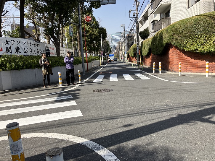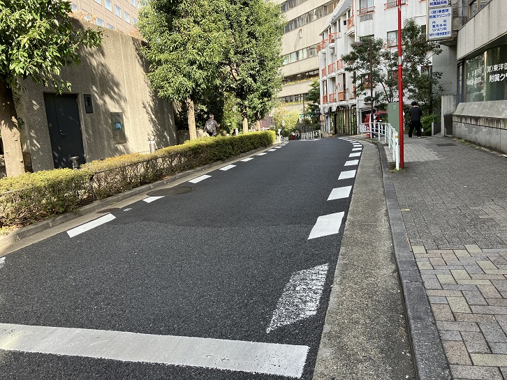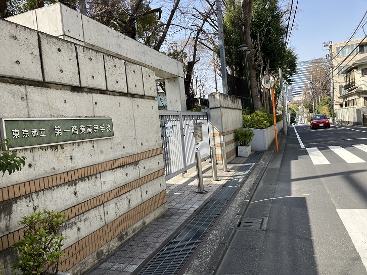 都立第一商業高等学校の裏門の先から鉢出町交番前交差点まで坂が下っています。