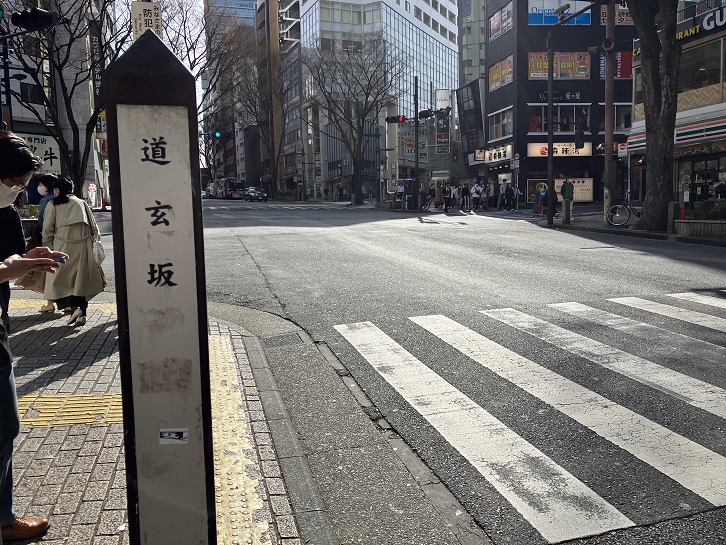 道玄坂は長さが約570mほどのやや右に曲がりながら下る緩やかな坂です。別名を「道源坂・道元坂」といいます。一説には、平安時代末期から鎌倉時代初期にかけての武将であった和田義盛が建歴三年に滅亡し、その一族の残党の大和田道元というのがこの辺りの洞窟に隠れ住んで山賊となっていたことに因むという説があります。一方、道元という僧がいて、この辺りに道元寺があったことに因むという説もあります。道玄坂上交番前交差点付近に案内柱が立っています。