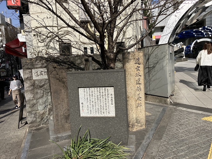 道玄坂上交番前交差点の角に「道玄坂道供養碑」の碑が建っています。その横には道玄坂の歴史を解説したプレートをはめ込んだ石板が建っています。