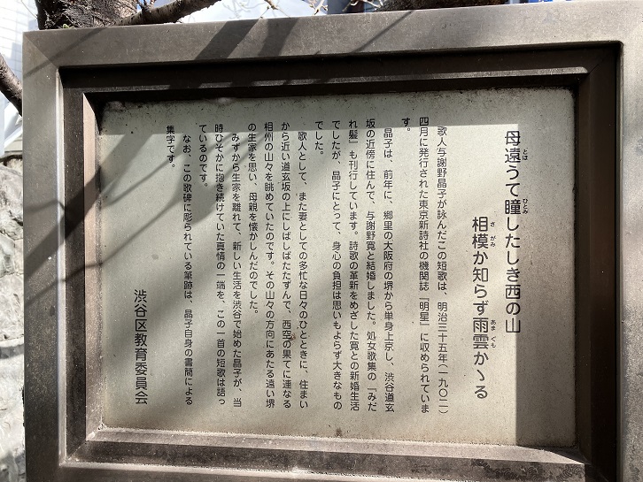 歌人与謝野晶子が詠んだこの短歌は、明治三十五年(1902年)四月に発行された東京新詩社の機関誌「明星」に収められています。晶子は、前年に、郷里の大阪府の堺から単身上京し、渋谷道玄坂の近傍に住んで、与謝野寛と結婚しました。処女歌集の「みだれ髪」も刊行しています。詩歌の革新をめざした寛との新婚生活でしたが、晶子にとって、身心の負担は思いもよらず大きなものでした。歌人として、また妻としての多忙な日々のひとときに、住まいから近い道玄坂の上にしばし(ば)たたずんで、西空の果てに連なる相州の山々を眺めていたのです。その山々の方向にあたる遠い堺の生家を思い、母親を懐かしんだのでした。みずから生家を離れて、新しい生活を渋谷で始めた晶子が、当時ひそかに抱き続けていた真情の一端を、この一首の短歌は語っているのです。なお、この歌碑に彫られている筆跡は、晶子自身の書簡による集字です。