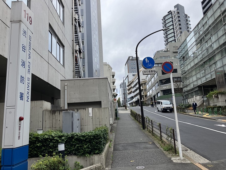 山手線の高架沿いに原宿方向に進みます。渋谷消防署横から渋谷区役所前交差点まで坂が上がっています。
