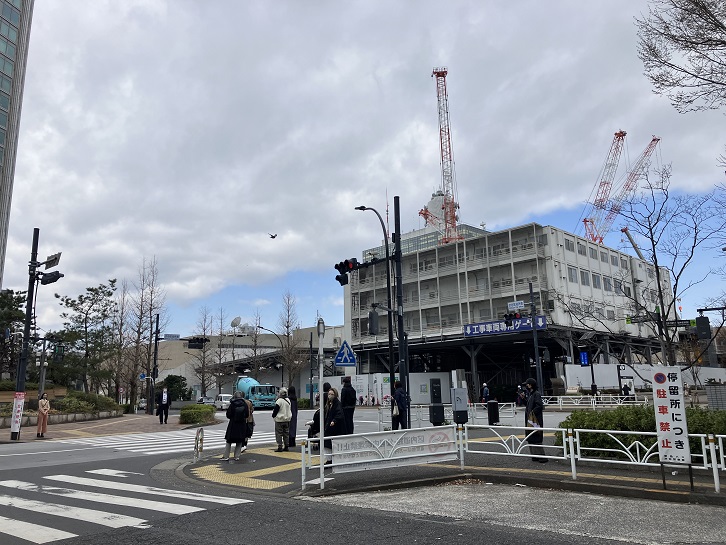 渋谷区役所前交差点からNHK放送センターを眺めますと、工事用のクレーンが林立しています。NHK放送センターは、2021年5月から15年をかけてNHKホールを除く全ての建物が建替えられることになっています。現在はT期工事として、情報棟の新設工事が行なわれています。中断が許されない放送業務ですから、工事も大変ですね。