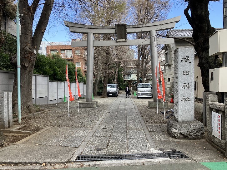 東京電力館前交差点で山手線のガードを潜り、神宮前六丁目交差点で明治通りを横断し、渋谷高校の左手の細い路地を進みます。途中に旧穏田村の産土神である隠田神社があります。元々は第六天社と呼ばれていた寺院でしたが、明治維新で廃寺となって穏田神社と改められました。明治十八年(1885年)に同じ穏田村に鎮座していた熊野神社を合祀し、現在は「縁結び」を始め、「技術や芸の上達」や「美容」にご利益があるとされています。「産土神」とは、神道において人が生まれた土地の守護神を指します。人が生まれる前から死んだ後まで守護する神とされていて、他の土地に移住しても一生を通じ守護してくれると信じられています。