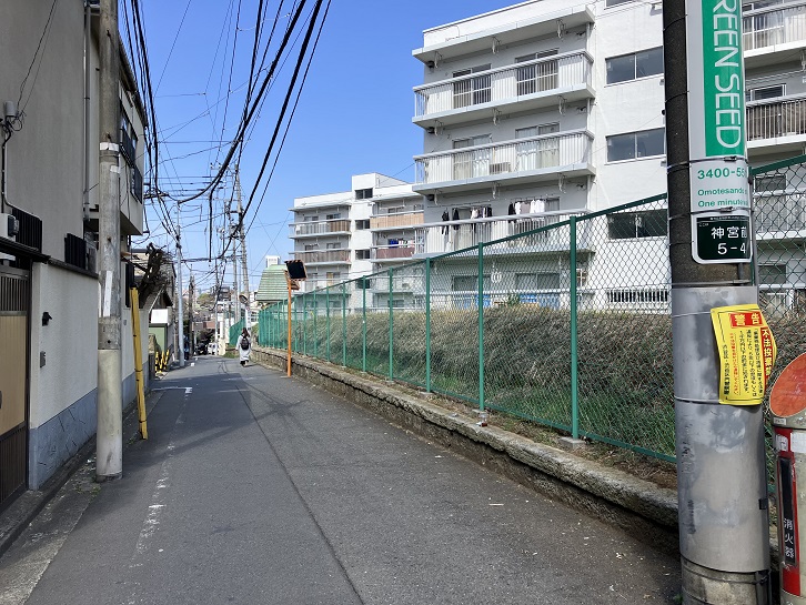 穏田神社から次の坂に向います。公務員神宮前宿舎付近から天理教の教会前を通って屈曲しながら坂が下っています。