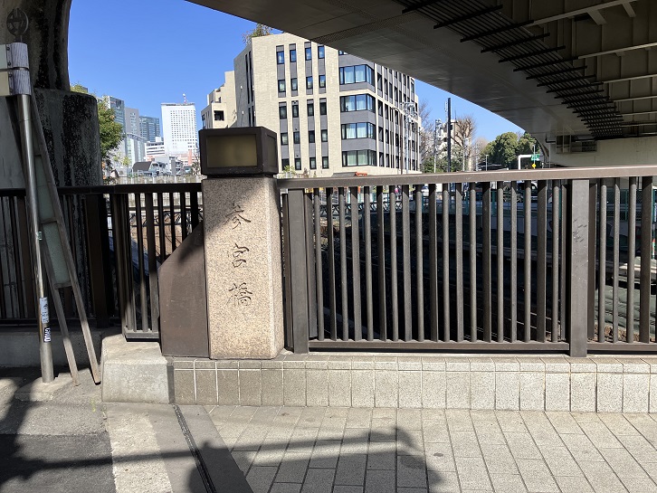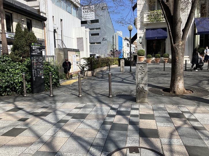 表参道と交差する小道があります。「HARAJYUKU ST」という名称で、その両側には時代の先端をいくアパレル関係のお店が建並んでいます。交差点脇に「表参道まちかど庭園」と名づけられた小さなスペースが設けられています。ここには旧参道橋の親柱が二基残されています。この小道はかっての渋谷川の跡に造成されたものです。ちなみに、この小道は表参道と交差した先は遊歩道となり、「穏田キャットストリート」という名前が付けられていますが、これには理由があります。かつては穏田川と呼ばれて水車を回していた渋谷川ですが、「穏田」という地名の由来は徳川幕府が開かれた400年近く前に遡ります。家康は信頼していた伊賀忍者の一族郎党をこの辺りに住まわせました。忍者の隠れ里ということで「隠田(おんでん)」と呼ばれましたが、いつからか「穏田」という字を使うようになりました。当時はのどかな農村で、穏田には渋谷川の水流を利用した水車があちこちにあり、その風景は葛飾北斎の富嶽三十六景のひとつの「隠田の水車」として描かれています。昔はまだこの界隈は住宅街で子どもたちが大勢いましたが、周辺に公園がなかったために、子どもたちの遊び場をつくろうと現在のキャットストリートがある場所に滑り台やブランコ・砂場などが設置されました。やがて公園にはどこからともなく野良猫が集まり始めました。周辺の住人が餌を与えたために猫の数は増え続け、しだいに猫だらけの公園になっていきました。「キャットストリート」という名称の由来には諸説ありますが、そのように多くの猫が集まっていたからというのが最有力の説とのことです。
