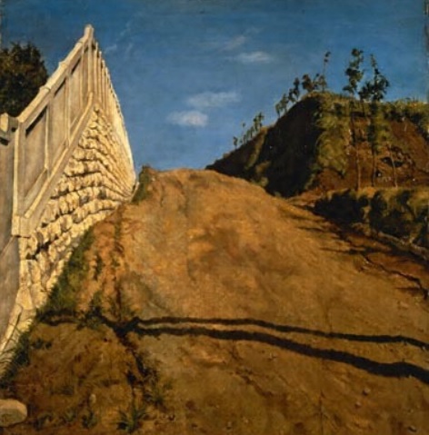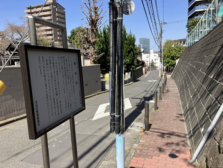 画家岸田劉正は、大正三年(1914年)から大正五年(1916年)にかけて代々木山谷に住んでいたので、このあたりを描写した作品がたくさんあります。そのうちの一点に名作「道路と土手と堀(切通之写生)」(重要文化財)があり、この前の坂を描いたものです。