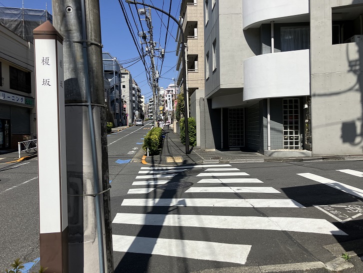 榎坂は長さが約80mほどの緩やかな坂です。坂名の由来は、かって坂の途中に榎の巨木があったことに因みます。坂下の駐車場の角に案内柱が立っています。