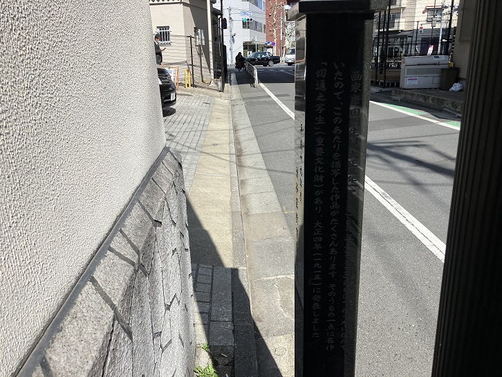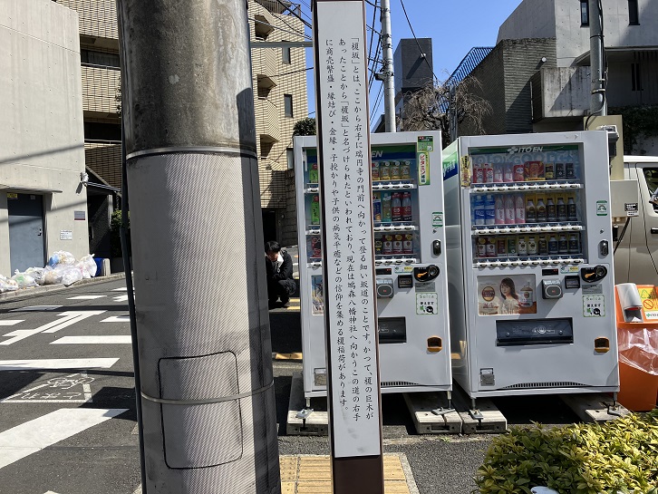 立正寺の前に坂名の由来を記した石柱が建っています。真っ黒で何が書いてあるか分かりませんね。