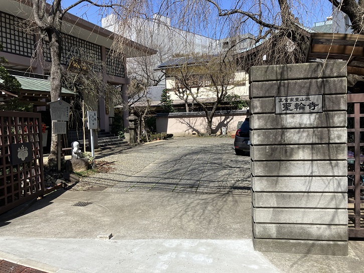 外苑西通りの観音橋交差点の西側の路地の先に聖輪寺というお寺があります。境内には、観音様のいわれを記した案内板が立っています。