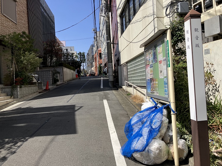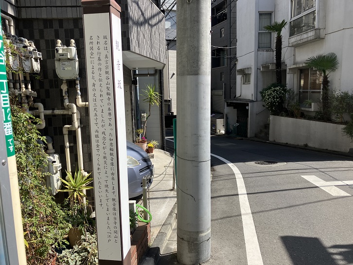 観音坂は長さが約80mほどの緩やかな坂です。坂名は、近くの聖輪寺の本尊だった如意輪観音像に由来します。坂の中ほどに案内柱が立っています。