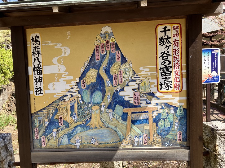 この富士塚は寛政元年(1789年)の築造といわれ、円墳形に土を盛り上げ、黒ばく【石ヘンに卜】(富士山の溶岩)は頂上近くのみ配されている。山腹には要所要所に丸石を配置しており、土の露出している部分には熊笹が植えられている。頂上には奥宮を安置し、山裾の向って左側に木造の里宮の建物がある。頂上に至る登山道は正面に「く」の字形に設けられ、自然石を用いて階段としている。七合目には洞窟がつくられ、その中には身禄像が姿置されている。塚の前面には池があるが、この池は塚築造のため土を採掘した跡を利用したもので、円墳状の盛り土、前方の池という形は江戸築造の富士塚の基本様式を示している。この富士塚は大正十二年(1923年)の関東大震災後に修復されているが、築造当時の旧態をよく留めており、東京都内に現存するものではもっとも古く、江戸中期以降、江戸市中を中心に広く庶民の間で信仰されていた富士信仰の在り方を理解する上で貴重な資料である。