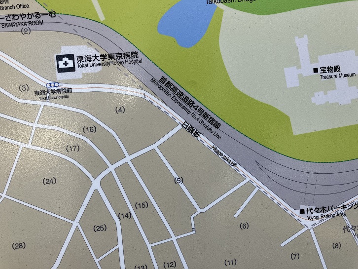 八幡坂から明治通りに出て明治神宮の北参道に向かいます。北参道入口交差点の先で首都高4号新宿線の高架下を潜りますと、東海大学付属病院付近から首都高沿いに坂が上がっています。