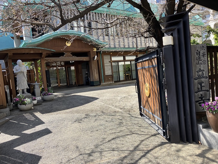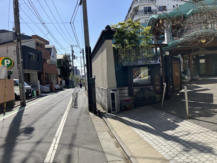 参宮橋交差点から首都高4号新宿線の高架に沿って西参道通りを進んで代々木地域安全センター前交差点で左折し、高架下を潜った先の右手に立正寺があります。