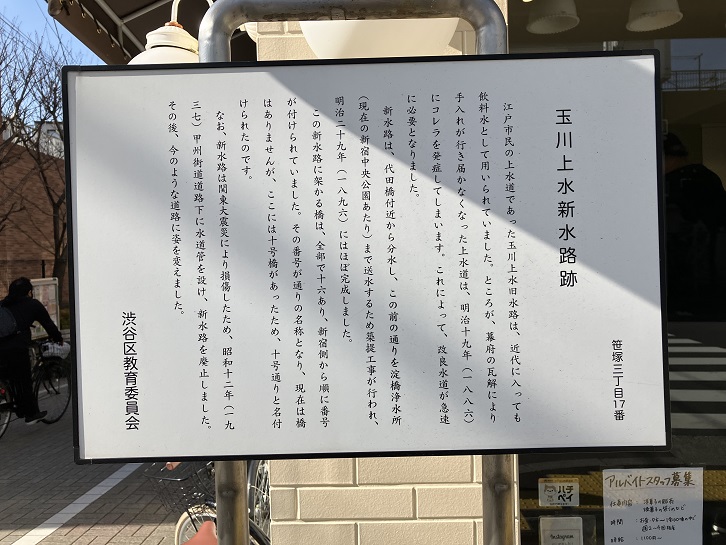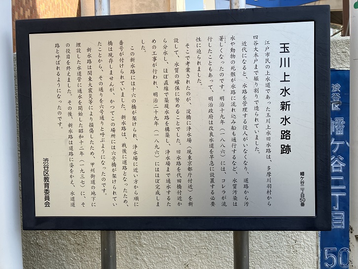 甲州街道から幡ヶ谷駅手前の六号通商店街に入り、商店街を抜けた水道道路の社会教育館前交差点角に玉川上水の案内板が立っています。玉川上水の旧水路は甲州街道の南側にありますが、この新水路は明治・大正期に使用され、その後現在の水道道路に生まれ変わったんですね。