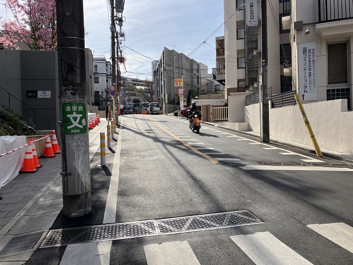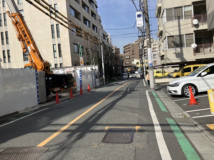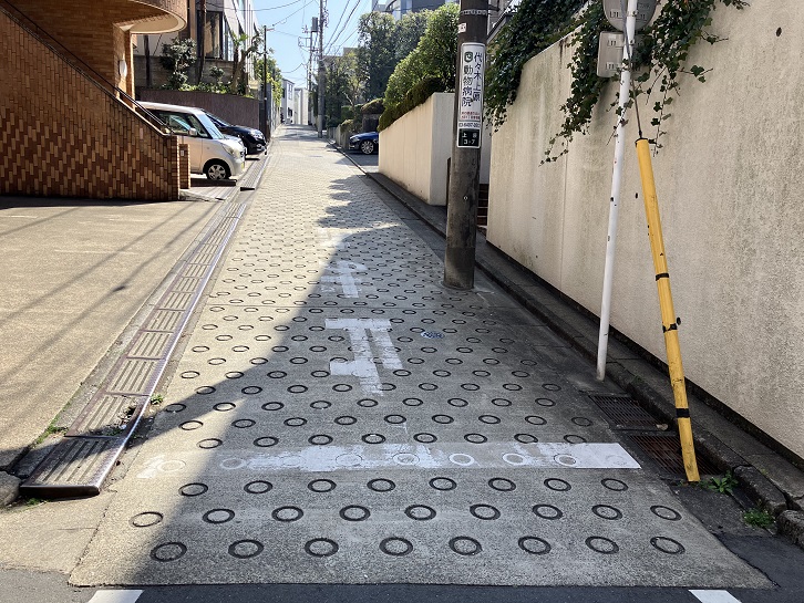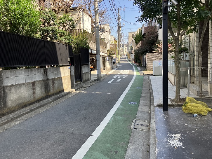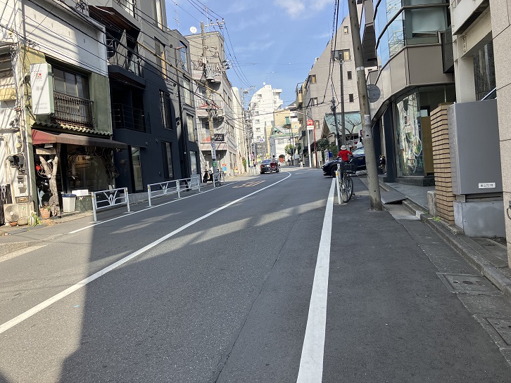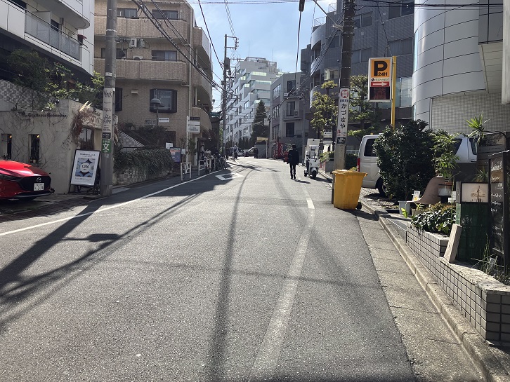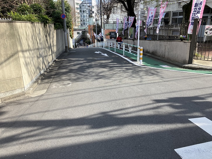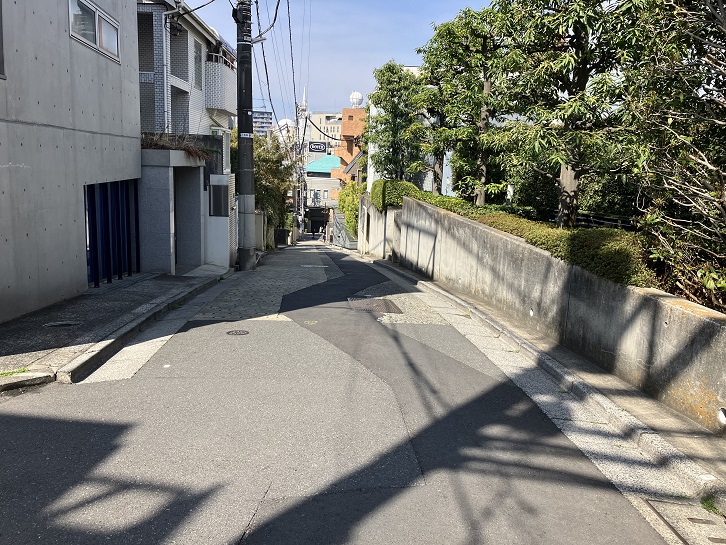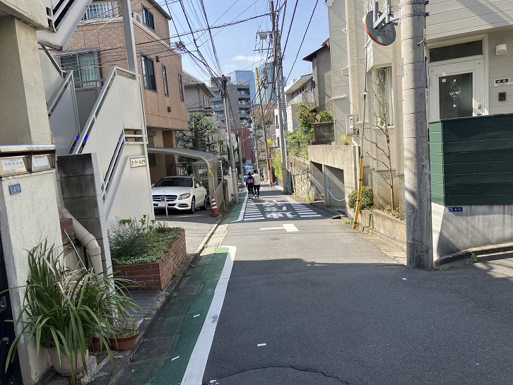 日赤医療センターに向かい合う東京女学館の北端の交差点から渋谷区広尾三丁目と港区南青山七丁目の境界に沿って進みますと、二股路の左側の細い坂が東4丁目交差点に向かって下っています。