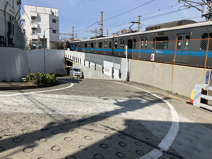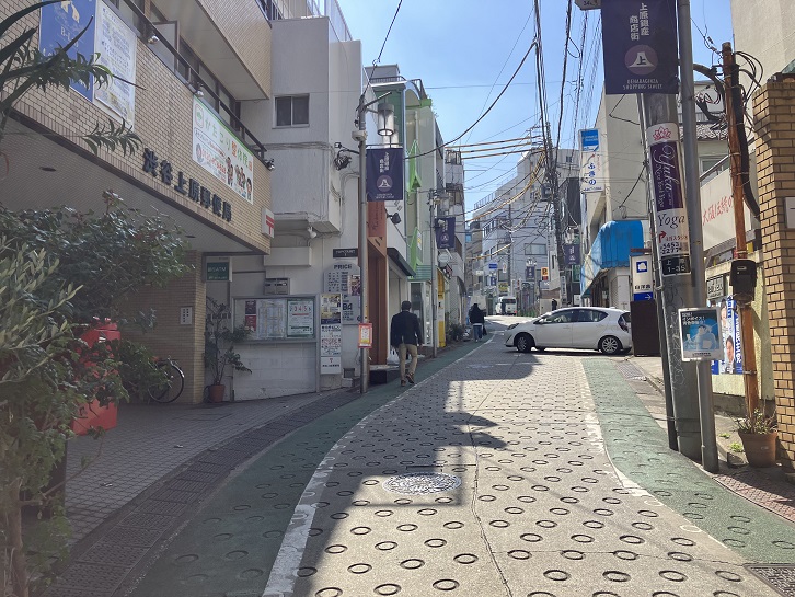代々木上原駅東口の線路脇から渋谷上原郵便局前を通って商店街の坂が上がっています。