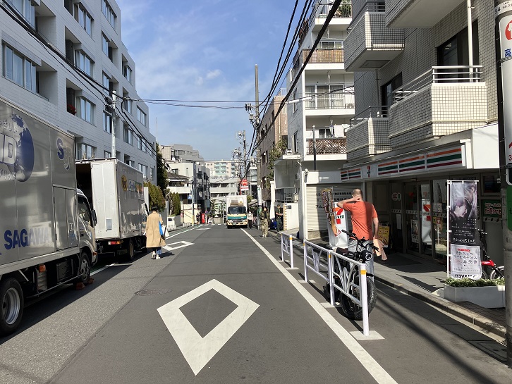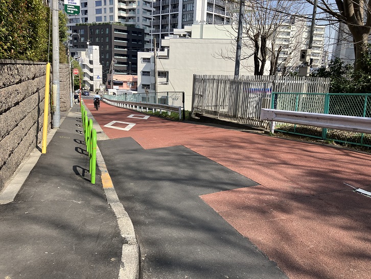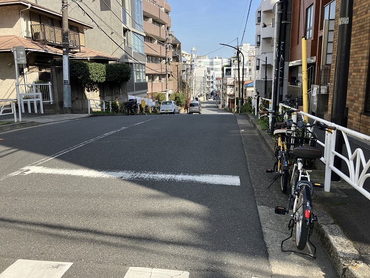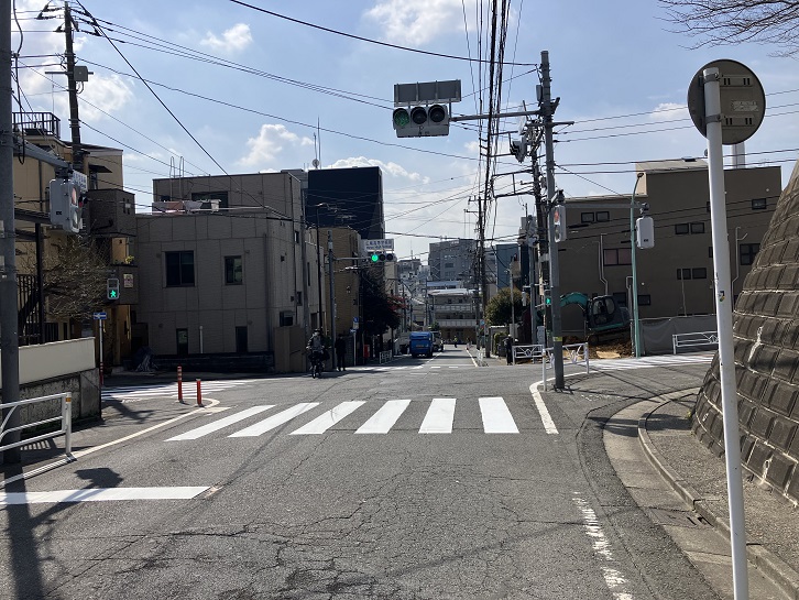 広尾高等学校前交差点から明治通りの東三丁目交差点まで坂が下っています。
