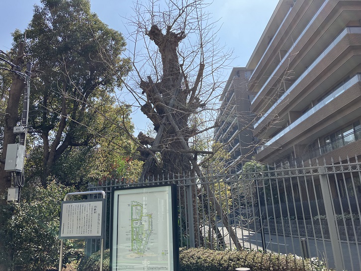 広尾北公園に隣り合って広尾ガーデンフォレストがあります。広尾ガーデンフォレストは、広尾ガーデンヒルズの北西隣接地に竣工した大規模マンションです。桜レジデンス(A棟・B棟)、楓レジデンス(C棟・D棟)、白樺レジデンス(E棟・F棟)、椿レジデンス(G棟・H棟)と名付けられた全8棟のマンションに、合計674戸が配置されているほか、郵便局なども入居する業務棟も設けられています。駐車場をすべて地下化することで車両と歩行者の動線を分離しています。セキュリティも万全で、日本赤十字医療センターとの医療連携サービスも備えられています。50年後にはマンションは取り壊されて更地になるそうなので、永久の住まいとはいかないようです。その敷地の角に枝を切り落とされて立ち枯れたようになった大銀杏の木が植わっています。でも、渋谷区の散歩道で4月の末に訪れた時は青葉が繁っていましたので、枯れている訳ではありません。