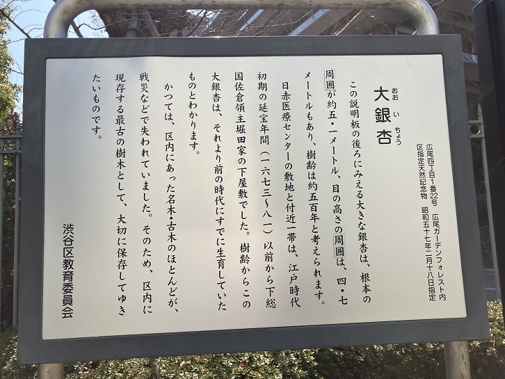 この説明板の後ろにみえる大きな銀杏は、根本の周囲が約5.1メートル、目の高さの周囲は、4.7メートルもあり、樹齢は約五百年と考えられます。日赤医療センターの敷地と付近一帯は、江戸時代初期の延宝年間(1673年〜1681年)以前から下総国佐倉領主堀田家の下屋敷でした。樹齢からこの大銀杏は、それより前の時代にすでに生育していたものとわかります。かつては、区内にあった名木・古木のほとんどが戦災などで失われていました。そのため、区内に現存する最古の樹木として、大切に保存してゆきたいものです。