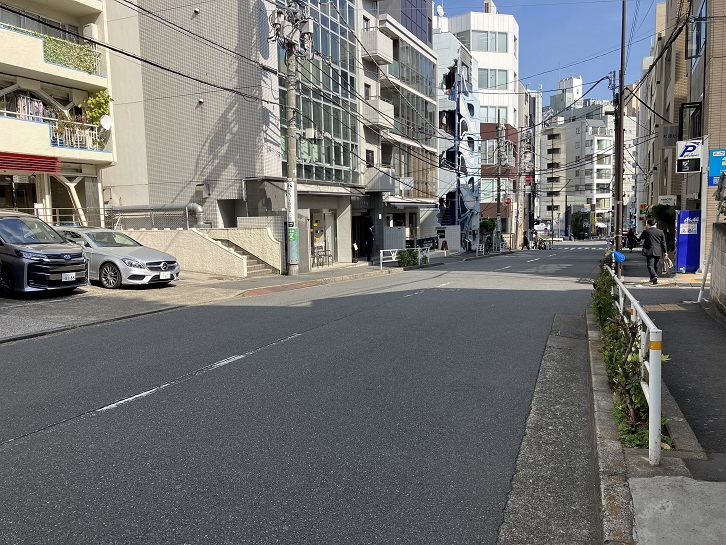 恵比寿西一丁目交差点は五差路になっていますが、地下に潜った東横線の手前にあるミスター・フレンドリー・カフェの前まで坂が上っています。