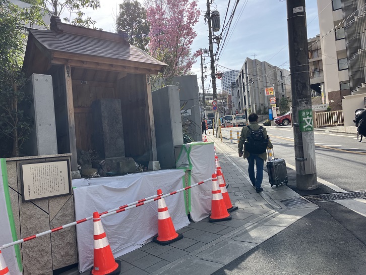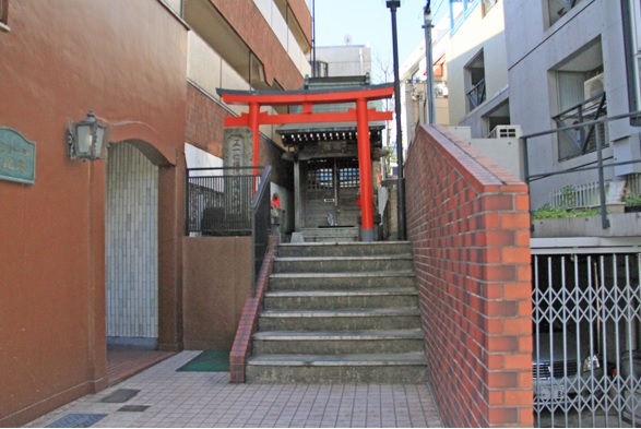 更に調べて見ると、飲食ビルの建設で一時的に取り壊され、新ビルが完成した後でビルの屋上に遷されるとのことです。工事中のビルは見当たりませんので、既に新ビルは竣工済と思われますが、いくら背伸びをしても坂に面したビルの屋上に稲荷社は見当たりません。一般の人も参拝出来るようなるとのことなんですけど。
