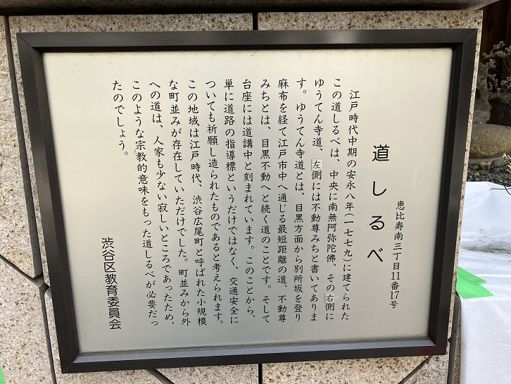 江戸時代中期の安永八年(1779年)に建てられたこの道しるべは、中央に南無阿弥陀佛、その右側にゆうてん寺道、左側には不動尊みちと書いてあります。ゆうてん寺道とは、目黒方面から別所坂を登り、麻布を経て江戸市中へ通じる最短距離の道、不動尊みちとは、目黒不動へと続く道のことです。そして台座には道講中と刻まれています。このことから、単に道路の指導標というだけではなく、交通安全についても祈願し造られたものであると考えられます。この地域は江戸時代、渋谷広尾町と呼ばれた小規模な町並みが存在していただけでした。町並みから外への道は、人家も少ない寂しいところであったため、このような宗教的意味をもった道しるべが必要だったのでしょう。