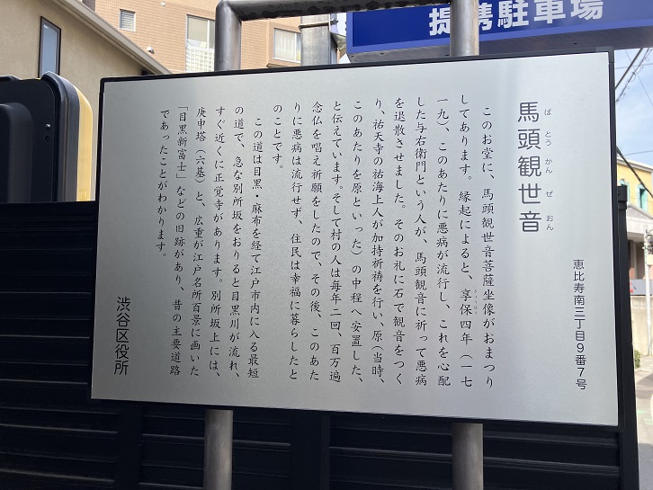 このお堂に、馬頭観世音菩薩がおまつりしてあります。縁起によると、享保四年(1719年)、このあたりに悪病が流行し、これを心配した与右衛門という人が、馬頭観音に祈って悪病を退散させました。そのお礼に石で観音をつくり、祐天寺の祐海上人に加持祈祷を願い、原(当時、このあたりを原といった)の中程へ安置した、と伝えています。そして村の人は毎年二回、百万遍念佛を唱え祈願をしたので、その後、このあたりに悪病は流行せず、住民は幸福にくらしたとのことです。この道は目黒・麻布を経て江戸市内に入る最短の道で、急な別所坂をおりると目黒川が流れ、すぐ近くに正覚寺があります。別所坂上には、庚申塔(六基)と、広重が江戸名所百景に画いた「目黒新富士」などの旧跡があり、昔の主要道路であったことがわかります。
