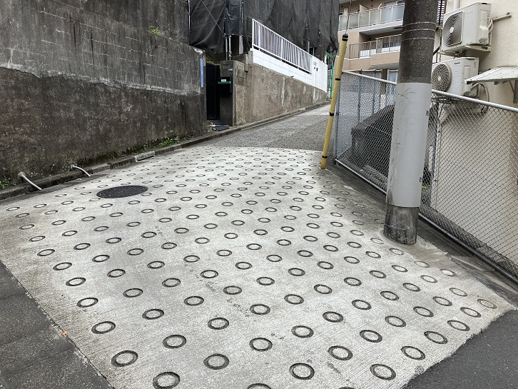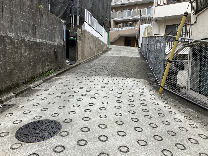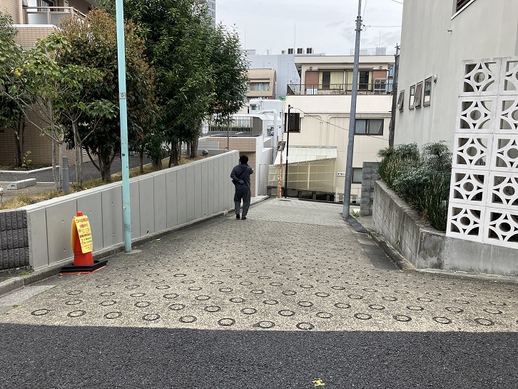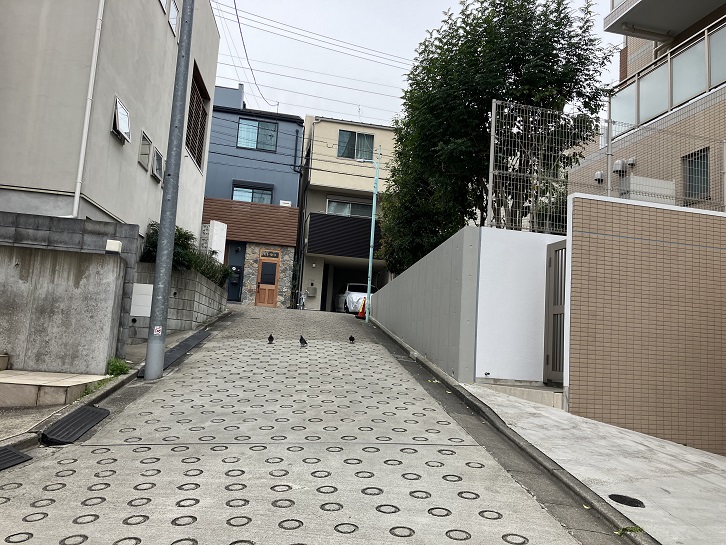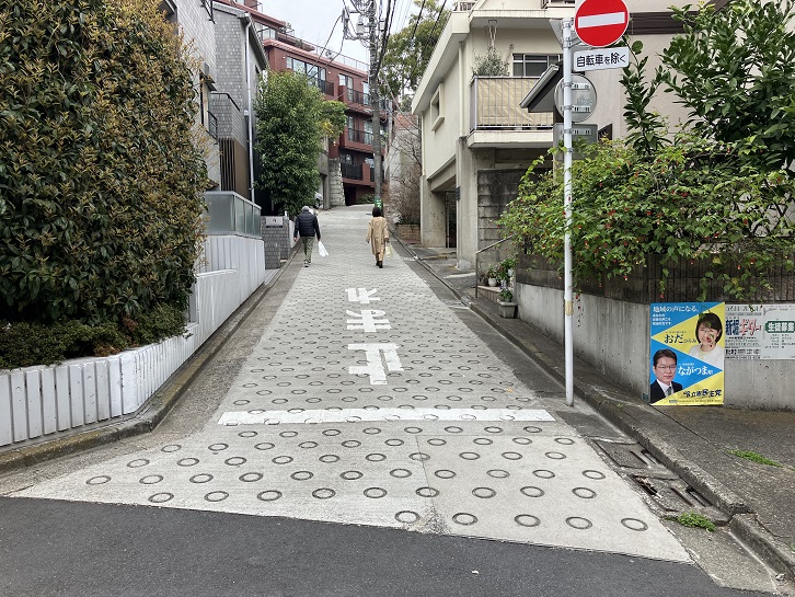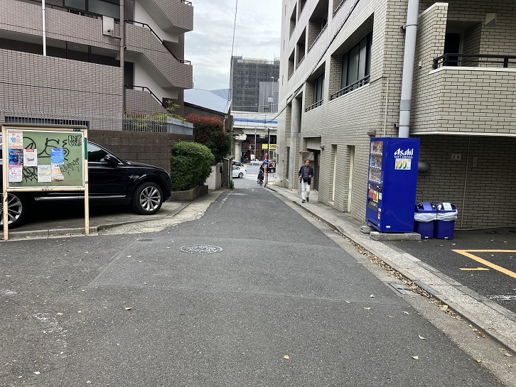 恵比寿郵便局交差点のひとつ手前の路地を左に入り、その先で右折した左手に細い路地があり、そこから坂が上がっています。