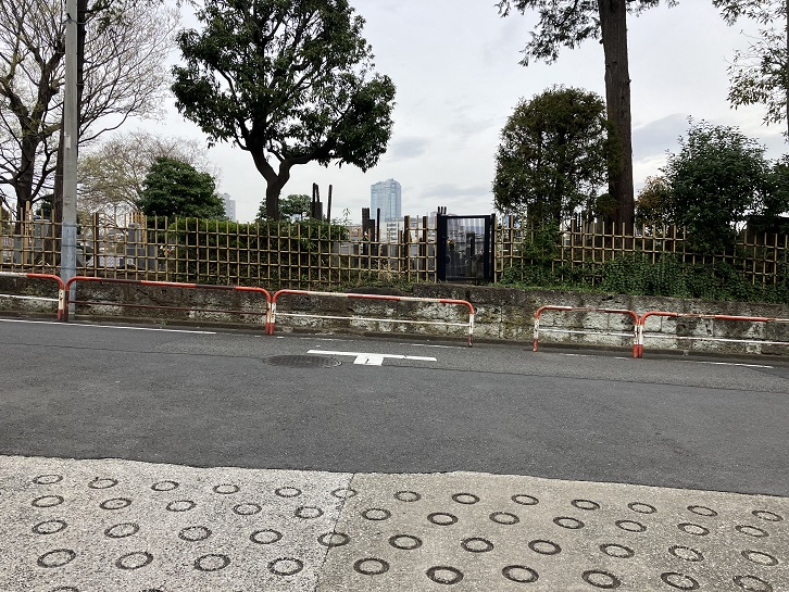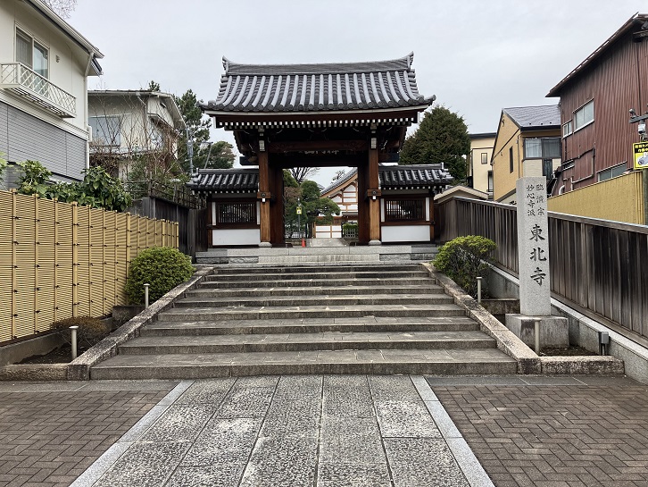 明治通りから50mほど内側に入った路地の左手に、東北寺の墓地に向かって右方向に曲がりながら坂が上がっています。