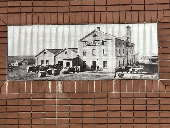 坂上の恵比寿ガーデンプレイスにはサッポロビールの本社があります。壁には、かってのビール工場の長閑な風景を描いたプレートがはめ込んであります。出来上がったビールは樽に詰めて出荷していたんですね。坂道で車から落ちて転がったら渋谷川まで止まらなかったことでしょう。