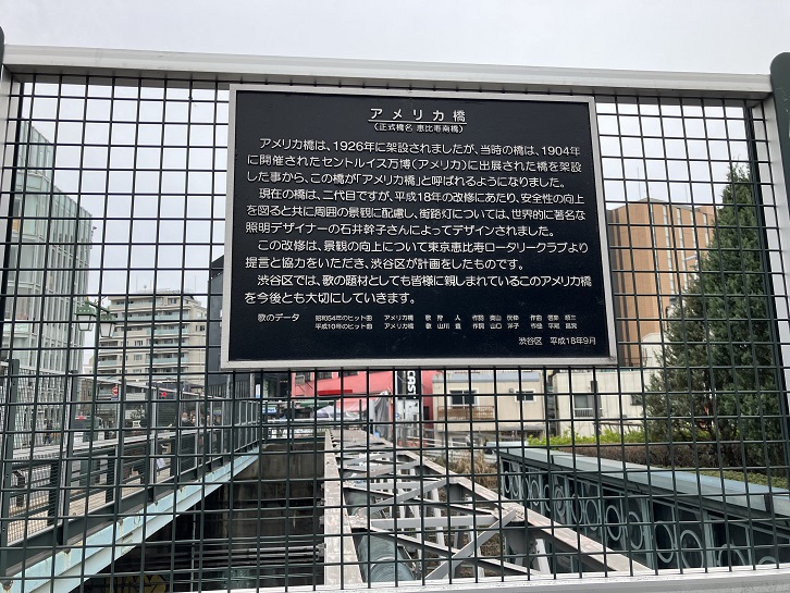 アメリカ橋は、1926年に架設されましたが、当時の橋は、1904年に開催されたセントルイス万博(アメリカ)に出展された橋を架設した事から、この橋が「アメリカ橋」と呼ばれるようになりました。現在の橋は、二代目ですが、平成十八年の改修にあたり、安全性の向上を図ると共に周囲の景観に配慮し、街路灯については、世界的に著名な照明デザイナーの石井幹子さんによってデザインされました。この改修は、景観の向上について東京恵比寿ロータリークラブより提言と協力をいただき、渋谷区が計画をしたものです。渋谷区では、歌の題材としても皆様に親しまれているこのアメリカ橋を今後とも大切にしていきます。