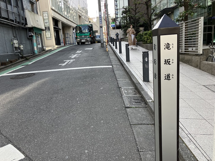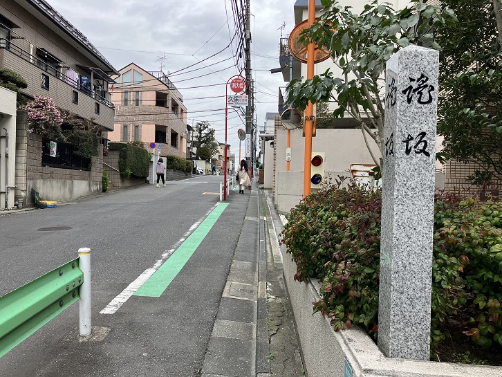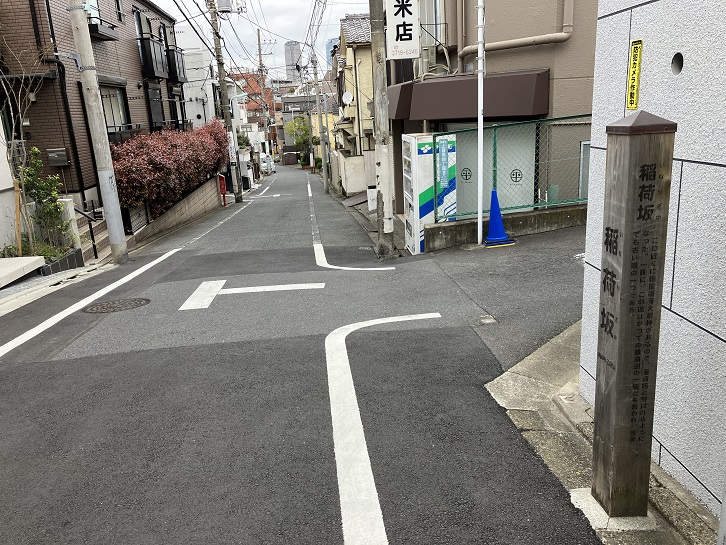 稲荷坂は長さが約150mほどの緩やかな坂です。私は見逃しましたが、坂の途中に棘抜稲荷の祠があることから「稲荷坂」という名前が付けられました。坂の途中に案内柱が立っています。