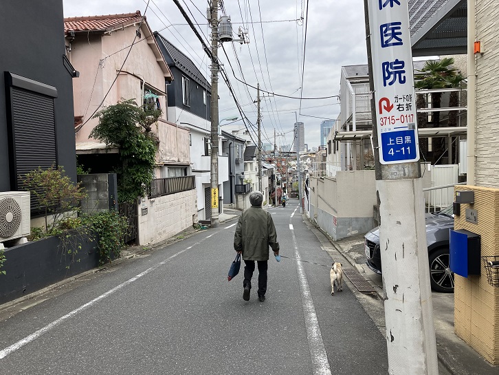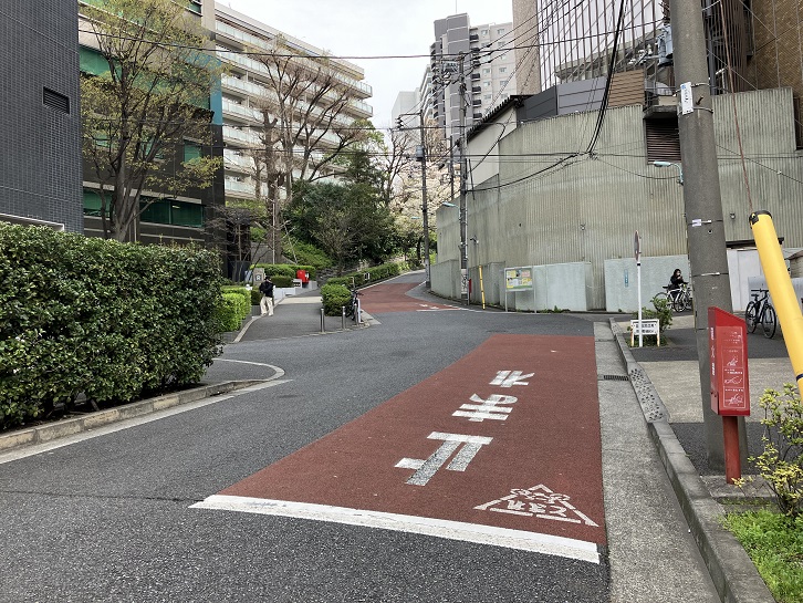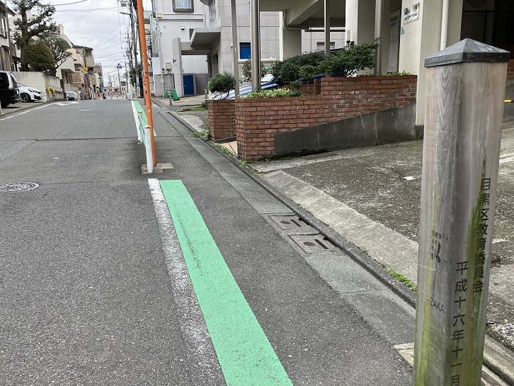 次の坂は目黒川から少し離れた場所にあります。山手通りの東山一丁目交差点を横断し、路地を入った先から烏森小学校の前まで長い坂が上がっています。
