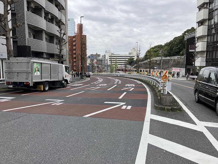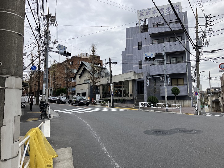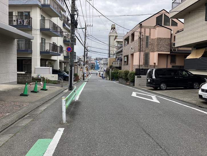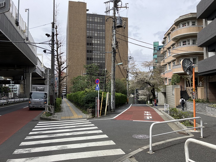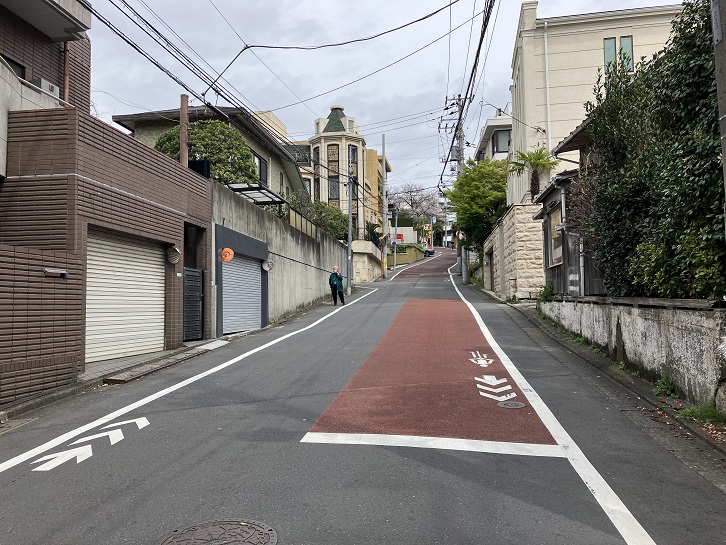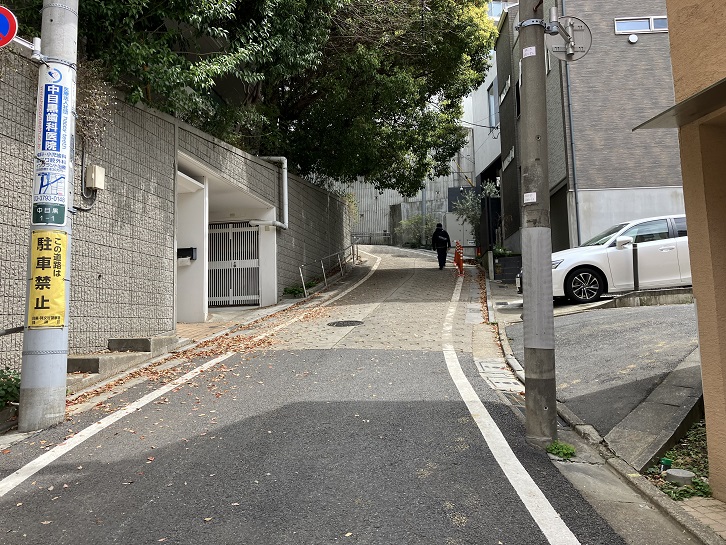 ロイヤルパレス上目黒付近から蛇崩交差点に向かって坂が下っています。