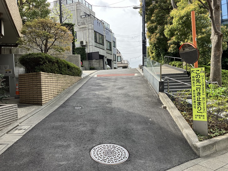 あまりの急勾配なために、坂上には階段が併設されています。勿論、自動車は通り抜けできません。坂上は曲がり角の先にありますので坂下からは見通しがきかず、標識を見落として無理して上がるとUターンもできず、悲惨なことになります。