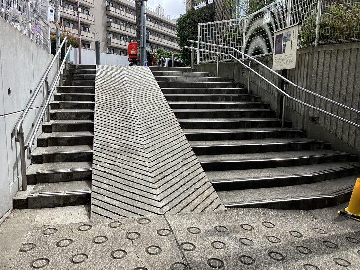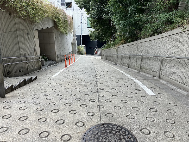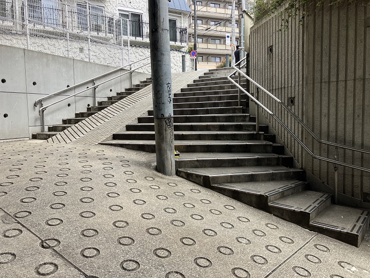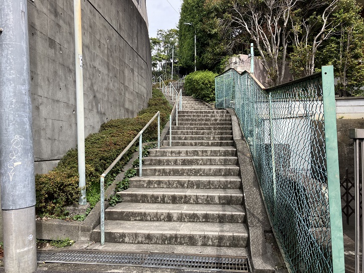 玉川通りを歩道橋で渡りますと、住友不動産の青葉台タワー(ラ・トゥール青葉台)の手前に超短い坂と階段が上がっています。坂上を進みますと、その先には階段が下っています。