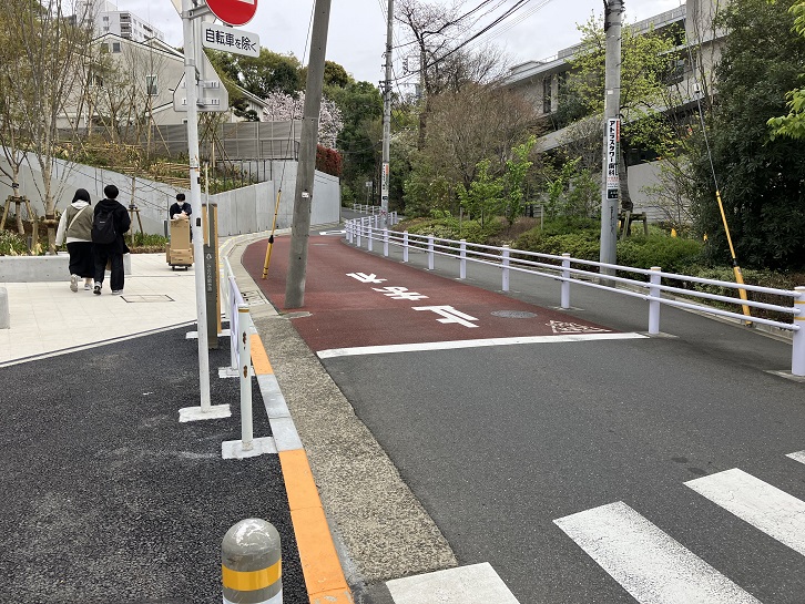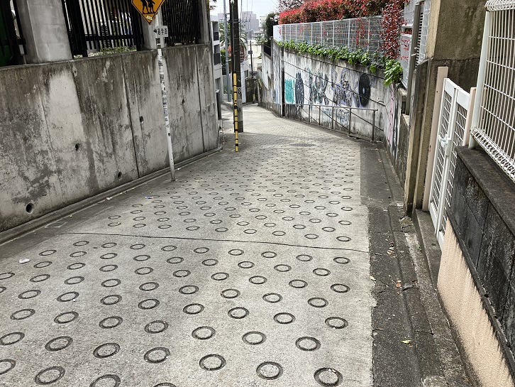 蛇坂の階段下から100mほど先に菅刈小学校があります。その西側のフェンスに沿って玉川通りに向かうやや急な坂が上がっています。