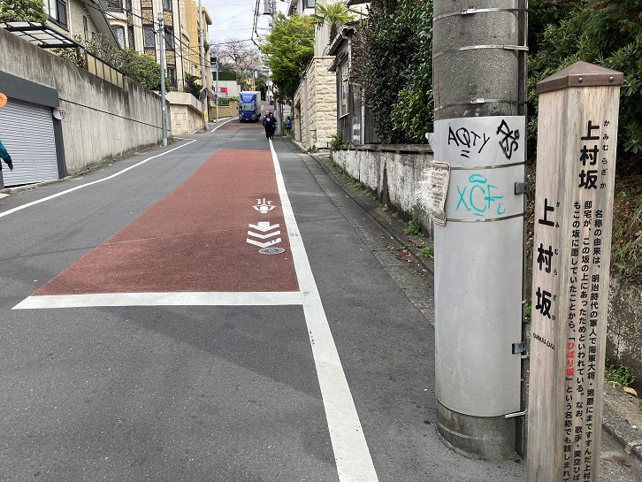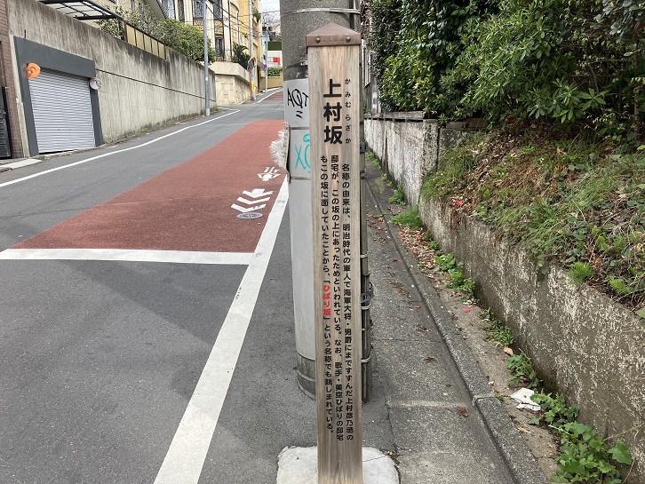 上村坂は長さが約180mほどの弧を描くように右に曲がりながら下るやや急な坂です。坂名は、明治時代の軍人である上村彦之丞の邸が坂上にあったことに因んでいます。坂下の交差点脇に案内柱が立っています。