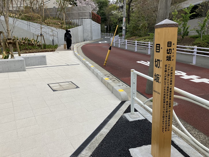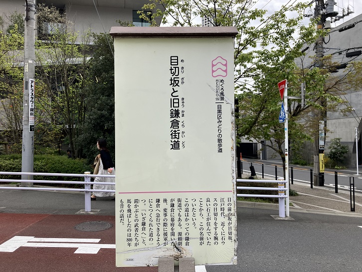 江戸時代の地誌「新編武蔵風土記稿」の上目黒村の項には「メキリ坂」という坂名がみえ、渋谷との境にあり石臼の目を切る職人が住んでいたため目切坂となったと記されています。