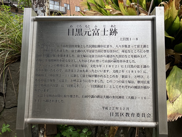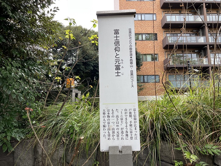 江戸時代に、富士山を崇拝対象とした民間信仰が広まり、人々が集まって富士講という団体が作られました。富士講の人々は富士山に登るほかに、身近なところに小型の富士(富士塚)を築きました。富士塚には富士山から運ばれた溶岩などを積み上げ、山頂には浅間神社を祀るなどし、人々はこれに登って山頂の祠を拝みました。マンションの敷地にあった富士塚は、文化九年(1812年)に上目黒の富士講の人々が築いたもので、高さは12mもあったといいます。文政二年(1819年)に、別所坂上(中目黒2−1)に新しく富士塚が築かれるとこれを「新富士」と呼び、こちらの富士塚を「元富士」と呼ぶようになりました。この二つの富士塚は、歌川広重の「名所江戸百景」に「目黒元不二」、「目黒新富士」としてそれぞれの風景が描かれています。元富士は明治以降に取り壊され、石祠や講の碑は大橋の氷川神社(大橋2−16−21)へ移されました。