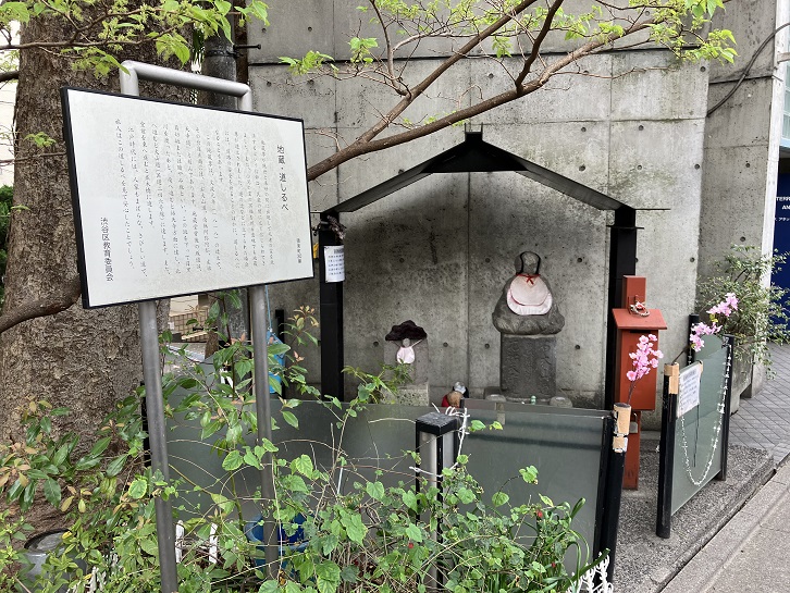 地蔵尊が現世と来世の間に出現して死者の霊を救済するという信仰は、民衆の間に広く信じられてきました。また、小児の霊の冥福を祈る意味でも地蔵尊が造立されました。道の辻などに建てられた場合には、道路の安全を祈ることのほかに、道しるべになることもあります。この地蔵尊は、文政元年(1818年)の造立で、その台座正面には、「右大山道、南無阿弥陀仏、左祐天寺道」と刻んであります。地蔵堂背後の坂道は、目切坂または暗やみ坂といい、この坂を下って目黒川を渡ったあと、南へ進むと祐天寺方面に達し、北へ進むと大山道(国道246号線)に達します。また、堂前を東へ進むと並木橋に達します。江戸時代には、人家もまばらな、さびしい道で、旅人はこの道しるべを見て安心したことでしょう。