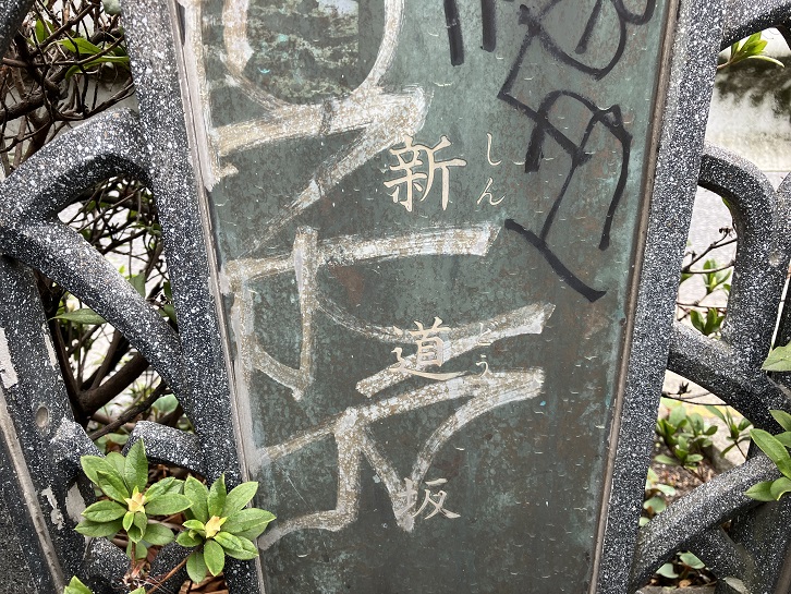 新道坂は長さが約170mほどの左に大きく曲がりながら緩やかに下る坂です。坂名は、別所坂と目切坂の間に新しく開かれた坂ということに因んで名付けられました。坂の途中に金属製の案内板が建っています。落書きが酷くて挿絵は判別できず、碑文も殆ど読み取れません。どうせ落書きするんであれば、自分の顔にすればいいのに。