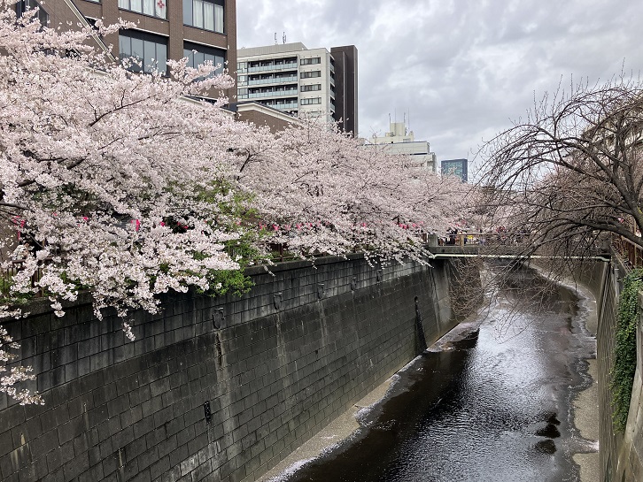 目黒川に架かる皀樹橋からは川面に垂れる満開の桜並木が眺められます。