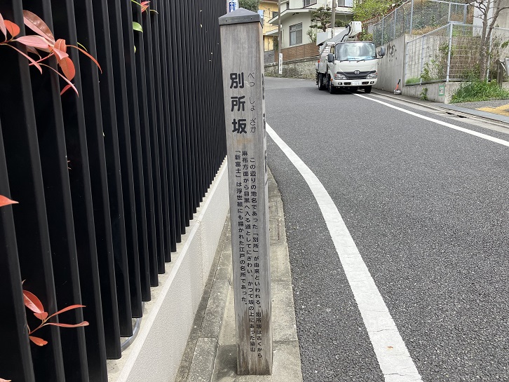 別所坂は長さが約150mほどの左右に大きく曲がりながら上る非常に急な坂です。坂名は、近くに「別所」という地名があったことに因んで名付けられました。坂下に案内柱が立っています。