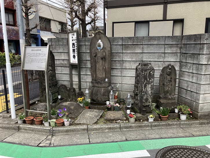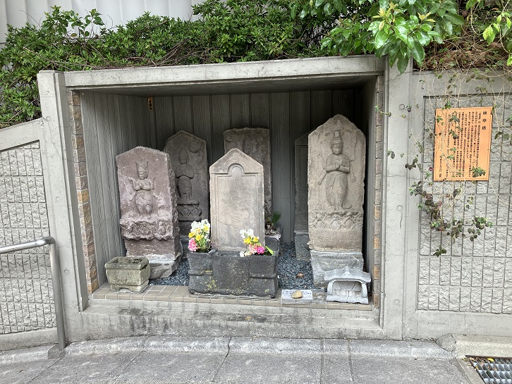 野沢通りの宿山交番前交差点の近くに庚申塔が建っています。